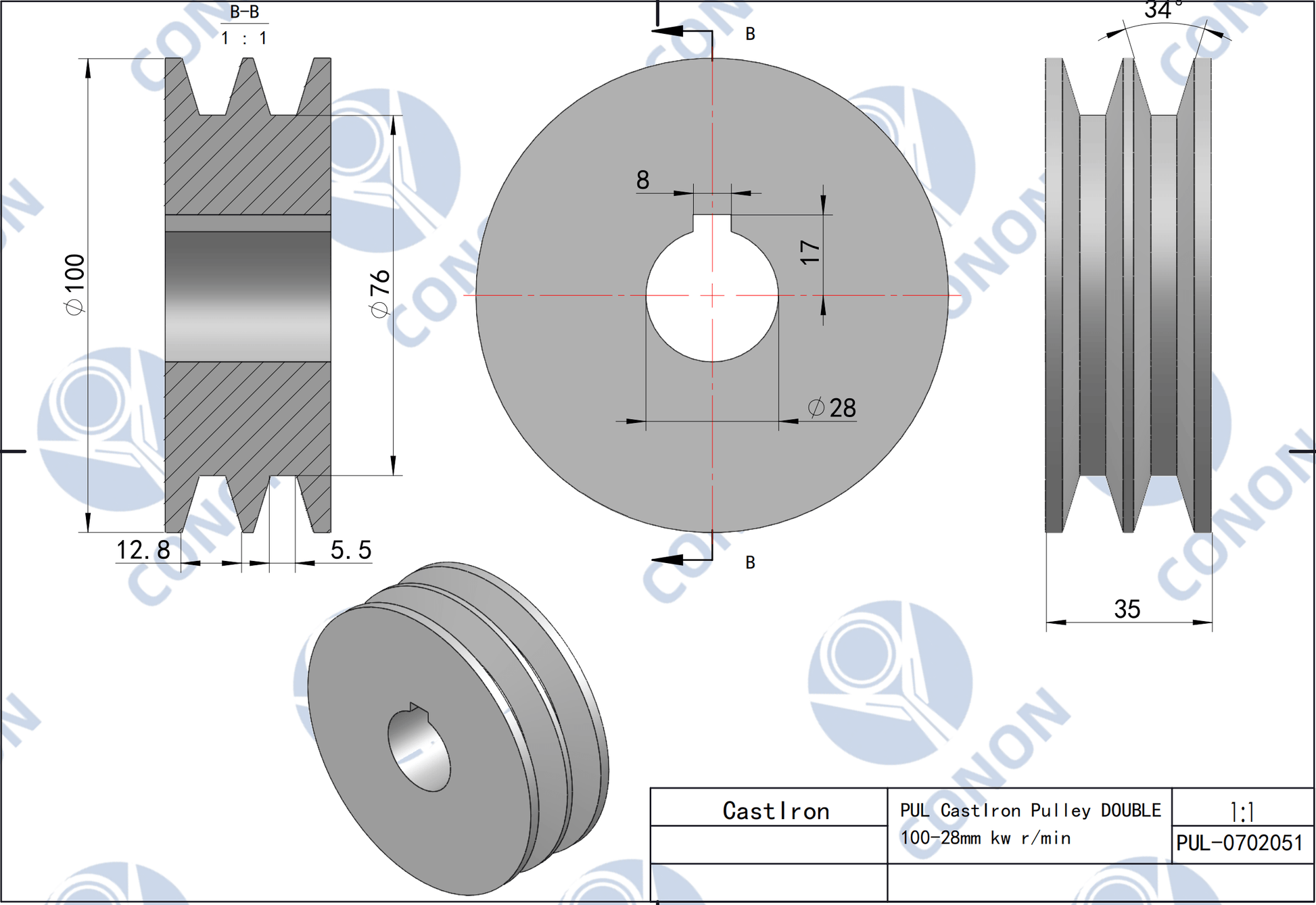Double groove Pulley 100mm shaft size 28mm for electric motor Cast Iron Made