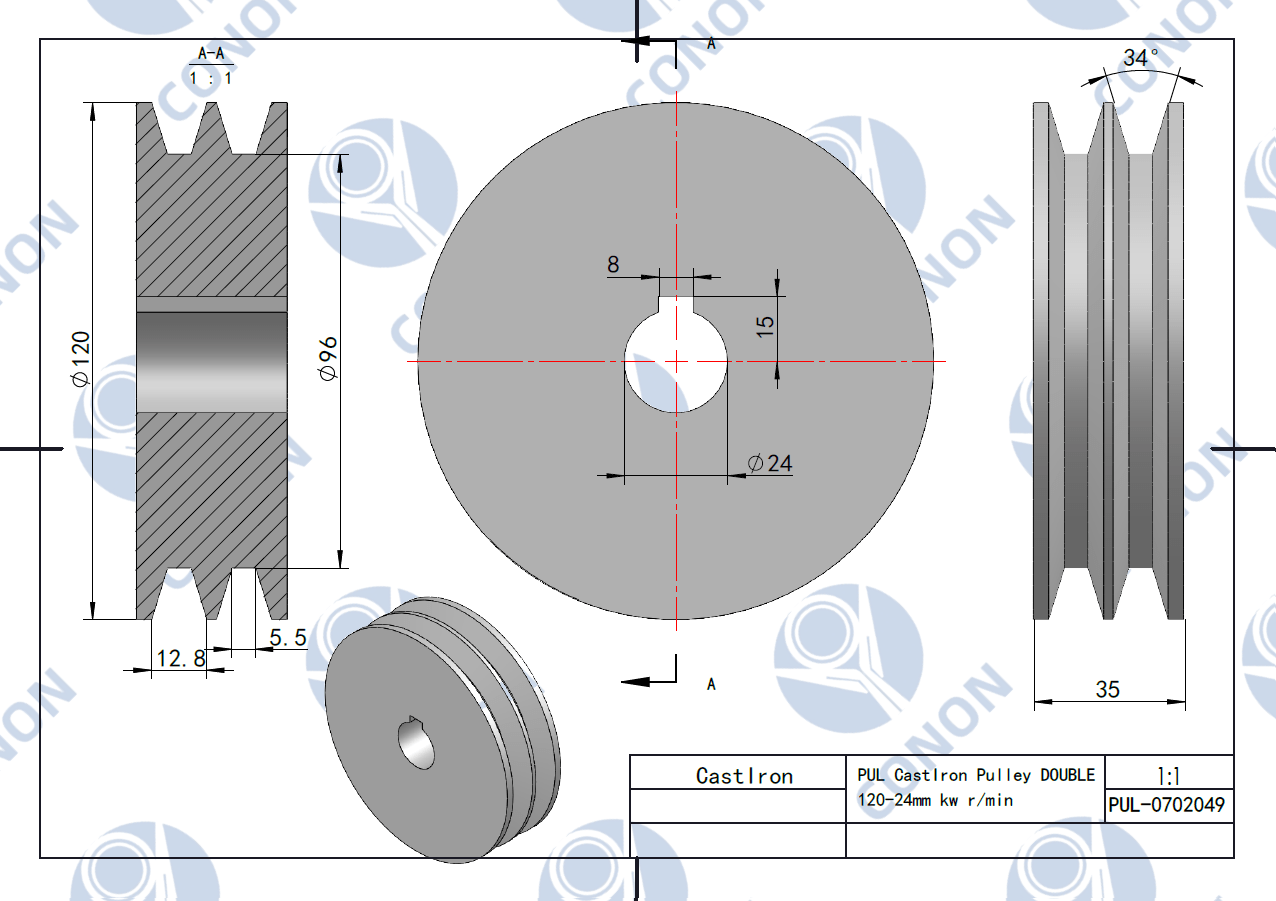 Double groove Pulley 120mm shaft size 24mm for electric motor Cast Iron Made