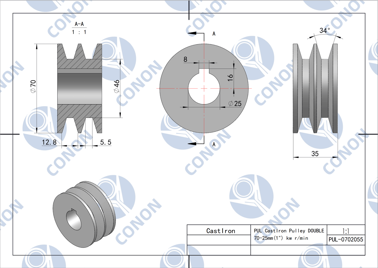 Double groove Pulley 70mm shaft size 25mm for electric motor Cast Iron Made