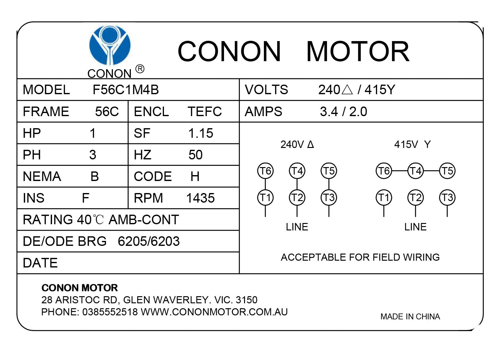 Three Phase NEMA Electric Motor 415V 0.75kW 1HP 1400rpm FRAME 56 1Ph CSCR 5/8"